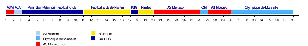 | Olympique de Marseille | 2-0 | 0-0 | 2-1 | 1-1 | 2-0 | 4-1 | 2-1 | 3-2 | 1-0 | 1-1 | 0-1 | 6-1 | 3-1 | 1-0 | 2-0 | 5-0 | 5-2 | 2-1 | 2-1 | |