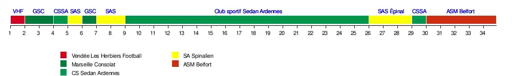 | CS Sedan Ardennes | 9 | 17 | 17 | 18 | 15 | 16 | 17 | 16 | 18 | 18 | 18 | 18 | 18 | 18 | 18 | 18 | 18 | 18 | 18 | 18 | 18 | 18 | 18 | 18 | 18 | 17 | 16 | 16 | 18 | 17 | 15 | 14 | 15 | 17 | 32 |