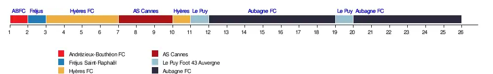| ÉFC Fréjus Saint-Raphaël | 0-0 | 0-0 | 0-0 | 0-0 | 0-0 | J25 | 0-0 | 2-2 | 1-0 | 0-0 | 3-0 | 0-0 | 3-1 | |