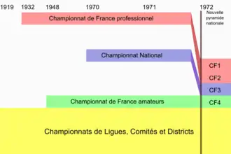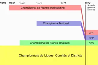 Au conseil national de juillet 1969, le projet d'unification des championnats amateurs et professionnels, avec l'institution d'un nouveau championnat National, pour des équipes à statut à la fois professionnel et amateur, est actée[1]. Cette réorganisation des championnats nationaux, opérée conjointement par la Fédération française de football et le Groupement du football professionnel, va s'opérer sur deux saisons entre 1970 et 1972[2]. La réforme est rendue possible grâce au retour au sein de la Fédération des équipes professionnelles.
