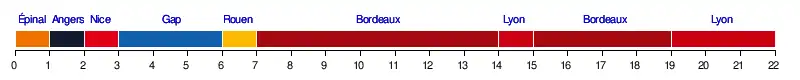 | Dijon | 10 | 11 | 9 | 9 | 9 | 7 | 8 | 10 | 10 | 9 | 7 | 7 | 11 | 11 | 10 | 10 | 10 | 10 | 10 | 10 | 10 | 10 | 18 | |