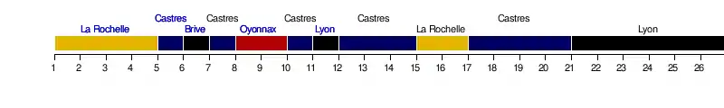 | Lyon OU | 24-19 | 22-37 | 24-6 | 28-18 | 16-13 | 29-24 | 23-20 | 26-23 | 12-9 | 11-13 | 16-16 | 14-22 | 17-41 | |