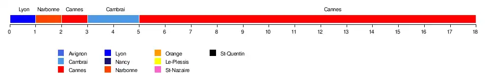 | Cannes | 3 | 3 | 1 | 2 | 2 | 1 | 1 | 1 | 1 | 1 | 1 | 1 | 1 | 1 | 1 | 1 | 1 | 1 | 14 |