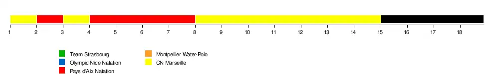 | Cercle des nageurs de Marseille | 1 | 2 | 1 | 2 | 3 * | 2 | 2 | 1 | 1 | |||||||||||