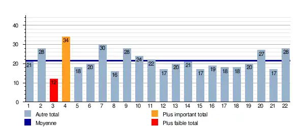 Ce graphique représente le nombre de buts marqués lors de chaque journée. Il est également indiqué la moyenne totale sur la saison qui est de 21,6 buts/journée.