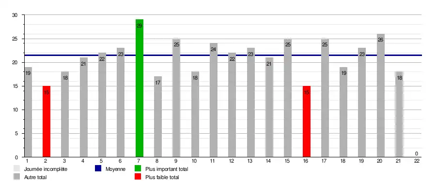 | Journée →/Équipe ↓ | 1 | 2 | 3 | 4 | 5 | 6 | 7 | 8 | 9 | 10 | 11 | 12 | 13 | 14 | 15 | 16 | 17 | 18 | 19 | 20 | 21 | 22 | 1er | Top 4 | rel. |