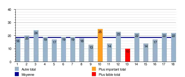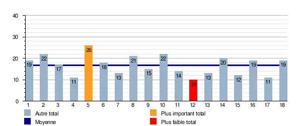 Ce graphique représente le nombre de buts marqués lors de chaque journée pour le groupe A. Il est également indiqué la moyenne total sur la saison qui est de 16,77 buts/journée.