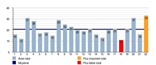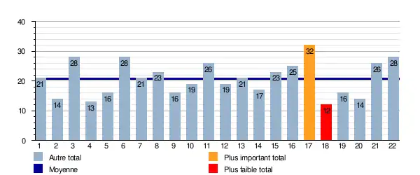 Ce graphique représente le nombre de buts marqués lors de chaque journée pour le groupe A. Il est également indiqué la moyenne total sur la saison qui est de 20,81 buts/journée.