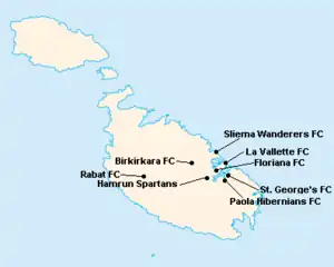 L'île de Malte étant relativement petite, les clubs évoluent tous au stade National Ta'Qali (17 400 places). Certain cependant ont leur propre enceinte qu'ils peuvent éventuellement utiliser.