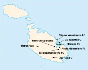 L'île de Malte étant relativement petite, les clubs évoluent tous au stade National Ta'Qali (17 400 places). Certain cependant ont leur propre enceinte qu'ils peuvent éventuellement utiliser.