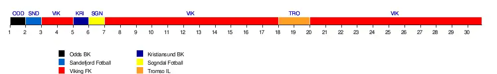 | Vålerenga | 7 | 7 | 9 | 16 | 9 | 12 | 12 | 10 | 7 | 9 | 8 | 8 | 7 | 6 | 6 | 7 | 7 | 11 | 11 | 12 | 12 | 12 | 11 | 10 | 9 | 8 | 8 | 9 | 6 | 8 | 1 | |