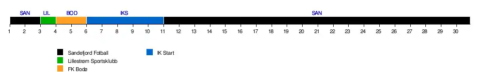 | Sandefjord | 16 | 16 | 10 | 14 | 11 | 12 | 14 | 15 | 15 | 15 | 16 | 16 | 16 | 16 | 16 | 16 | 16 | 16 | 16 | 16 | 16 | 16 | 16 | 16 | 16 | 16 | 16 | 16 | 16 | 16 | 25 | |