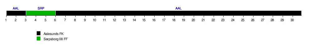 | Aalesunds FK | 16 | 16 | 15 | 14 | 15 | 16 | 16 | 16 | 16 | 16 | 16 | 16 | 16 | 16 | 16 | 16 | 16 | 16 | 16 | 16 | 16 | 16 | 16 | 16 | 16 | 16 | 16 | 16 | 16 | 16 | 0 | 29 |