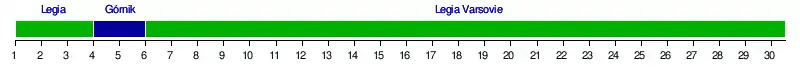 | Legia Varsovie (T) | 4-1 | 2-1 | 0-3A | 1-0 | 1-0 | 0-1 | 4-1 | 4-0 | 3-1 | 2-0 | 2-1 | 5-1 | 2-2 | 2-0 | 3-0 | |