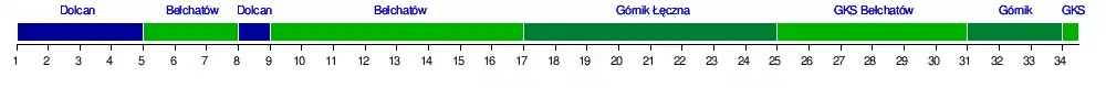 | GKS Bełchatów | 0-1 | 1-1 | 1-1 | 1-0 | 3-0 | 5-0 | 3-1 | 1-1 | 0-0 | 2-1 | 1-1 | 2-1 | 1-0 | 2-2 | 4-0 | 1-0 | 0-2 | |