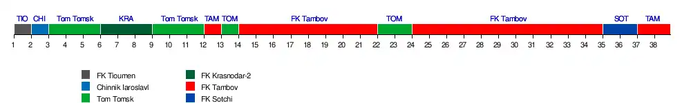 Le FK Sotchi parvient finalement à dépasser le Tom Tomsk dès la trente-deuxième journée à la faveur d'une victoire contre le Tchertanovo Moscou tandis que le Tom enchaîne un troisième match nul d'affilée contre le Luch Vladivostok, amenant à sa sortie des places de promotion directe pour la première fois depuis la fin de la deuxième journée[77],[78]. L'écart se creuse ensuite dès la journée suivante, Sotchi enchaînant une nouvelle fois contre le SKA-Khabarovsk tandis que le Tom est vaincu sur la pelouse du Sibir Novossibirsk lors du derby sibérien[79]. Cette journée voit par ailleurs le Zénith-2 être mathématiquement relégué, comptant dix-huit points de retard sur le maintien à cinq journées de la fin du championnat, de même pour le FK Tioumen qui en compte quinze mais ne peut refaire son retard en raison des confrontations entre les autres relégables[80].