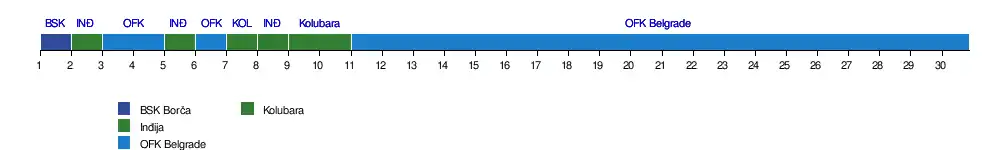 | OFK Belgrade | - | - | 0-0 | 0-2 | 3-3 | 1-0 | - | - | 0-1 | 0-2 | - | 0-1 | - | - | 0-2 | |