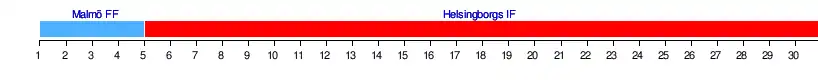 - Le , Helsinborgs IF devient officiellement le nouveau champion de Suède lors de la 27e journée de championnat, grâce à une victoire 3-1 sur le terrain de GAIS, combinée avec une défaite de l'IF Elfsborg sur le terrain de Mjällby AIF (3-1) et un match nul de l'AIK Solna à Malmö[30]. Lors de cette même journée, Halmstads BK est officiellement relégué en Superettan, la faute à une nouvelle défaite, la 19e, à domicile face à Syrianska FC, l'un de ses concurrents directs pour le maintien[31].