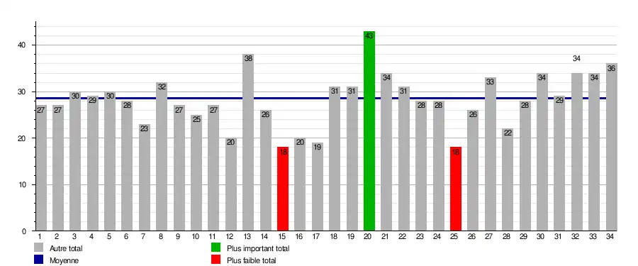 | Journée →/Équipe ↓ | 1 | 2 | 3 | 4 | 5 | 6 | 7 | 8 | 9 | 10 | 11 | 12 | 13 | 14 | 15 | 16 | 17 | 18 | 19 | 20 | 21 | 22 | 23 | 24 | 25 | 26 | 27 | 28 | 29 | 30 | 31 | 32 | 33 | 34 | 1er | prom. | bar. | rel. |