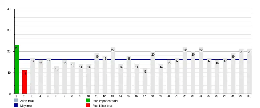 Ce graphique représente le nombre de buts marqués lors de chaque journée, pour un total de 515 buts en 30 journées (soit 17,17 par journée et 2,14 par match) :