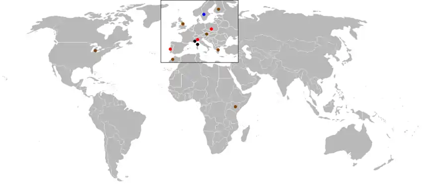 | Noir = asphalte | Marron = terre / gravier | Bleu = neige / glace | Rouge = surface mixte | ||||||||||
