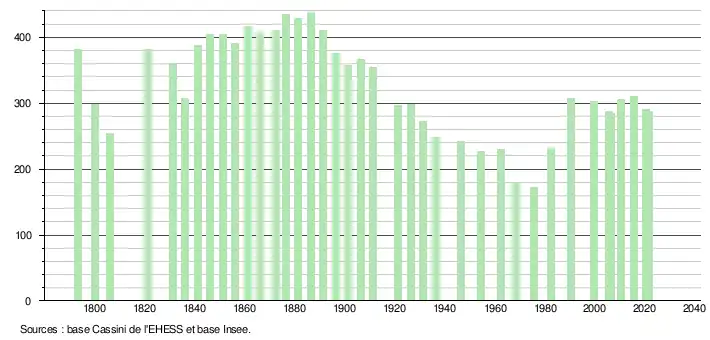 L'évolution du nombre d'habitants est connue à travers les recensements de la population effectués dans la commune depuis 1793. Pour les communes de moins de 10 000 habitants, une enquête de recensement portant sur toute la population est réalisée tous les cinq ans, les populations légales des années intermédiaires étant quant à elles estimées par interpolation ou extrapolation[21]. Pour la commune, le premier recensement exhaustif entrant dans le cadre du nouveau dispositif a été réalisé en 2005[22].