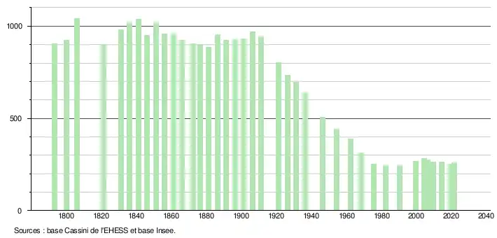 L'évolution du nombre d'habitants est connue à travers les recensements de la population effectués dans la commune depuis 1793. Pour les communes de moins de 10 000 habitants, une enquête de recensement portant sur toute la population est réalisée tous les cinq ans, les populations légales des années intermédiaires étant quant à elles estimées par interpolation ou extrapolation[23]. Pour la commune, le premier recensement exhaustif entrant dans le cadre du nouveau dispositif a été réalisé en 2004[24].