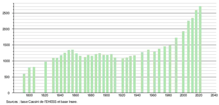 L'évolution du nombre d'habitants est connue à travers les recensements de la population effectués dans la commune depuis 1793. Pour les communes de moins de 10 000 habitants, une enquête de recensement portant sur toute la population est réalisée tous les cinq ans, les populations légales des années intermédiaires étant quant à elles estimées par interpolation ou extrapolation[19]. Pour la commune, le premier recensement exhaustif entrant dans le cadre du nouveau dispositif a été réalisé en 2006[20].