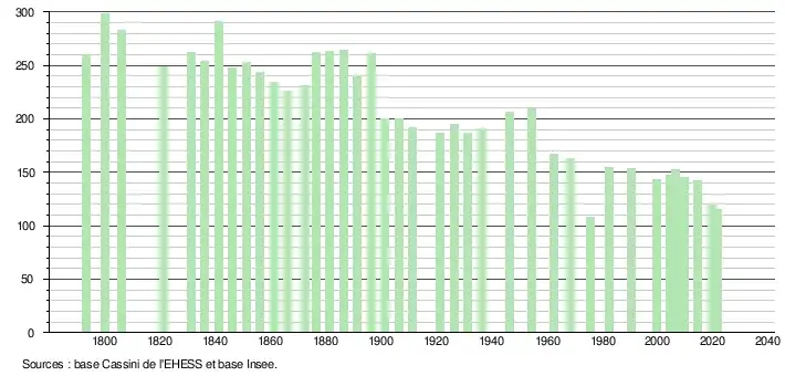 L'évolution du nombre d'habitants est connue à travers les recensements de la population effectués dans la commune depuis 1793. Pour les communes de moins de 10 000 habitants, une enquête de recensement portant sur toute la population est réalisée tous les cinq ans, les populations légales des années intermédiaires étant quant à elles estimées par interpolation ou extrapolation[24]. Pour la commune, le premier recensement exhaustif entrant dans le cadre du nouveau dispositif a été réalisé en 2004[25].