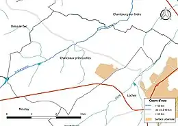 Le Chanteraine, d'une longueur totale de 12,2 km, prend sa source dans la commune de Mouzay, entre dans la commune au droit du bois de Beaurepaire, la traverse du sud-ouest vers le nord-est, et se jette dans l'Indre à Chambourg-sur-Indre[3]. Sur le plan piscicole, le Chanteraine est classé en deuxième catégorie piscicole. Le groupe biologique dominant est constitué essentiellement de poissons blancs (cyprinidés) et de carnassiers (brochet, sandre et perche)[4].