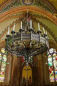 D'autres chandeliers sont en fer forgé quelquefois doré, et ils ont très souvent la forme d'une couronne[41],[44], quelquefois à cercles multiples et concentriques. Ce type de chandelier suspendu peut alors porter un nombre considérable de lumières.