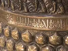 Un bandeau épigraphique en écriture cursive se déroule sous la frise des lions, comportant huit cartouches, cernés d'un filet de cuivre et, en alternance, huit motifs solaires avec un cœur de cuivre et huit pétales d argent. Cinq cartouches ont été totalement abrasés, contenant peut-être des noms ou informations plus précises sur l'origine de l'œuvre. Deux cartouches sont intacts[2].