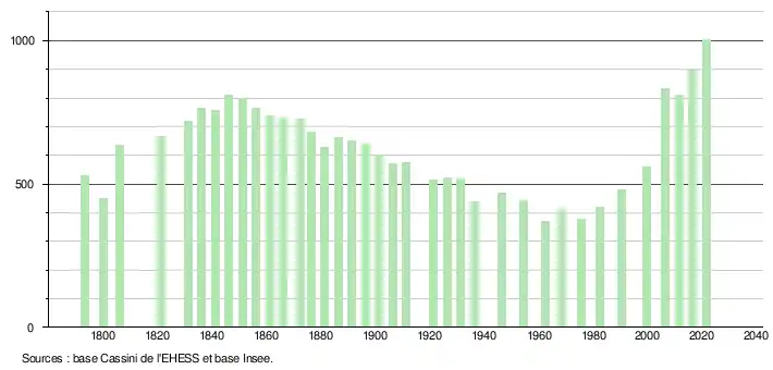L'évolution du nombre d'habitants est connue à travers les recensements de la population effectués dans la commune depuis 1793. Pour les communes de moins de 10 000 habitants, une enquête de recensement portant sur toute la population est réalisée tous les cinq ans, les populations légales des années intermédiaires étant quant à elles estimées par interpolation ou extrapolation[17]. Pour la commune, le premier recensement exhaustif entrant dans le cadre du nouveau dispositif a été réalisé en 2006[18].