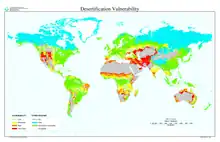 Les phénomènes de sécheresse, salinisation et désertification peuvent être aggravés par les modifications du climat, notamment dans le Sahel et le désert de Gobi. La désertification peut elle-même contribuer à des modifications locales et globales du climat, exemple en favorisant les incendies de savanes ou steppes, en étant une source importante de poussières (aérosols qui peuvent influer sur la pluviométrie) et par leur albédo (plus importante qu'un milieu végétalisé).
