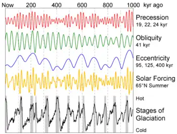 À l'échelle des dizaines et centaines de milliers d'années, les variations du climat sont gouvernées par des facteurs astronomiques, les paramètres de Milanković.