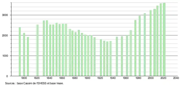 L'évolution du nombre d'habitants est connue à travers les recensements de la population effectués dans la commune depuis 1793. Pour les communes de moins de 10 000 habitants, une enquête de recensement portant sur toute la population est réalisée tous les cinq ans, les populations légales des années intermédiaires étant quant à elles estimées par interpolation ou extrapolation[20]. Pour la commune, le premier recensement exhaustif entrant dans le cadre du nouveau dispositif a été réalisé en 2005[21].