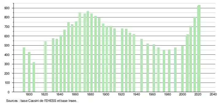 L'évolution du nombre d'habitants est connue à travers les recensements de la population effectués dans la commune depuis 1793. Pour les communes de moins de 10 000 habitants, une enquête de recensement portant sur toute la population est réalisée tous les cinq ans, les populations légales des années intermédiaires étant quant à elles estimées par interpolation ou extrapolation[24]. Pour la commune, le premier recensement exhaustif entrant dans le cadre du nouveau dispositif a été réalisé en 2005[25].