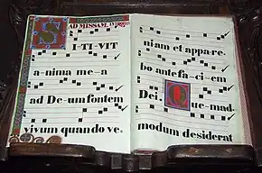 L'invention de Guido d'Arezzo de la notation en quatre lignes[w 11], vers 1030, contribua à ce phénomène, car le chant oralement conservé devint définitivement musique écrite et facilement transmissible[e 3].
