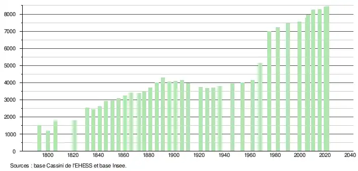 L'évolution du nombre d'habitants est connue à travers les recensements de la population effectués dans la commune depuis 1793. Pour les communes de moins de 10 000 habitants, une enquête de recensement portant sur toute la population est réalisée tous les cinq ans, les populations légales des années intermédiaires étant quant à elles estimées par interpolation ou extrapolation[41]. Pour la commune, le premier recensement exhaustif entrant dans le cadre du nouveau dispositif a été réalisé en 2005[42].