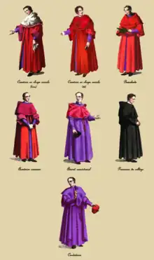 Les camériers secrets et les camériers d'honneur portaient une chape écarlate avec des agréments de couleur ponceau (rouge très vif) ; les avocats consistoriaux, la chape violette avec agréments de soie cramoisie et un chaperon ouvert à l'avant, les procureurs du collège une chape entièrement noire, avec les agréments de soie noire et un chaperon sans fourrure. Les caudataires des cardinaux, portent, sur une soutane violette boutonnée de noir, une sorte de chape de laine violette, avec revers de soie violette et un chaperon de soie mis de travers qui lui a valu le nom italien de crocia (croisière)[3].