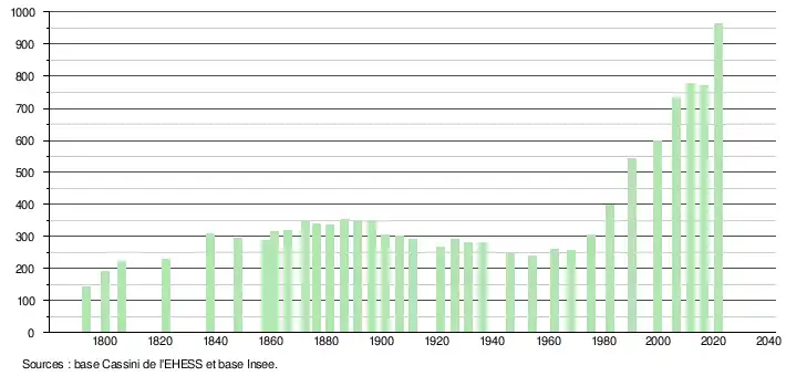 L'évolution du nombre d'habitants est connue à travers les recensements de la population effectués dans la commune depuis 1793. Pour les communes de moins de 10 000 habitants, une enquête de recensement portant sur toute la population est réalisée tous les cinq ans, les populations légales des années intermédiaires étant quant à elles estimées par interpolation ou extrapolation[12]. Pour la commune, le premier recensement exhaustif entrant dans le cadre du nouveau dispositif a été réalisé en 2006[13].