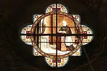 Au-dessus de la porte d'entrée, un vitrail de forme ronde représente un homme d'église priant la Sainte-Vierge à l'enfant.
