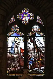 Dans le vitrail face à l'entrée, sont présentés les armoiries d'Olivier de Langlais et de son épouse Edwige de Francheville (qui firent reconstruire la chapelle).