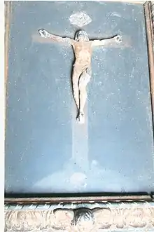 - Un crucifix, surmontant une tête de mort sur un cadre noir avec bordure dorée où se note une influence janséniste par la tête intégralement tournée vers le ciel. La position initiale des bras, actuellement catholiquement, étendue, n'a pas été établie. Il y a, plusieurs cassures dans ces bras aux couleurs modifiées. On peut supposer qu'ils devaient être plus levés, en harmonie avec la position de la tête ;