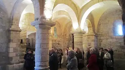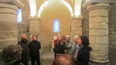 Cette chapelle se trouve à l'angle de la rue Notre-Dame et de la rue du 8-Mai-1945. Orienté régulièrement, le bâtiment est de plan rectangulaire, et se divise en deux étages. La chapelle basse présente trois vaisseaux de deux travées chacun, soit six travées au total. Leurs voûtes d'arêtes sont séparées par des arcs-doubleaux en plein cintre à arêtes vives, qui retombent sur deux piliers cylindriques isolés au milieu de la salle, et sur des piliers carrés engagés au droit des murs latéraux. Tous les piliers sont munis de tailloirs profilés d'une tablette et d'un cavet peu profond entre deux faibles ressauts. Le pilier isolé du côté nord possède un chapiteau dorique ébauché, et est appareillé en tambour. En guise de chapiteau, le pilier isolé du côté sud accuse un deuxième tailloir, qui est de plan octogonal, et profilé d'une plate-bande et d'un chanfrein. Ce pilier est appareillé moins régulièrement. Les deux piliers sont munis de bases moulurées d'un tore, d'une large scotie et d'un grand tore. Ni les voûtes, ni les supports sont de facture romane, et le chapiteau dorique indique plutôt la période classique. Le vaisseau central se termine par une absidiole en cul-de-four, qui a été reconstituée lors de la restauration des années 1980[5]. Le jour entre par de très petites fenêtres en plein cintre fortement évasées, à raison de deux à l'ouest, une au nord et au sud, et trois à l'est, dont une pour l'absidiole. L'on note que l'ébrasement ne concerne que les piédroits et l'archivolte. La fenêtre au chevet du vaisseau nord est aujourd'hui rectangulaire. À l'extérieur, plusieurs fenêtres présentent des linteaux monolithiques à claveaux simulés. La chapelle haute n'appelle que peu de remarques. Elle est accessible par un escalier extérieur côté nord, et munie d'un plafond de bois.