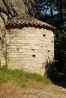 Sa façade méridionale est percée de deux fenêtres à arc monolithe et de nombreux trous de boulin (trous destinés à ancrer les échafaudages).