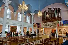 À l'intérieur de la chapelle, les colonnes cannelées des bas-côtés reposent sur des piédestaux et sont surmontées de chapiteaux corinthiens. Le plafond de la nef est voûté et agrémenté de cinq chandeliers en cristal de Waterford datant de 1802[5],[6]. Les fenêtres disposées de part et d'autre de la nef, ainsi que les couleurs, rendent l'intérieur très lumineux. Une peinture représentant le Grand sceau des États-Unis est accrochée au-dessus du banc où s'asseyait George Washington lorsqu'il venait dans l'église[1],[14]. Le buffet d'orgues en acajou conçu par John Geib date de 1804 et l'orgue a été restauré à plusieurs reprises en 1950, 1964 et 1981[16]. Il est resté silencieux entre 2001 et 2009[16].