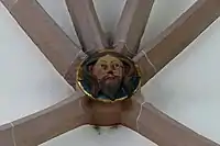 Les murs latéraux de la nef sont décorés d'une série de six bras de lumière en bois (bougeoirs sous forme d'avant-bras et mains).