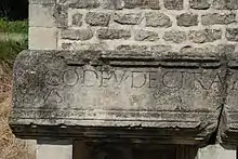 Devant la porte sont disposés trois fragments d'un énorme linteau d'origine romaine gravés d'une inscription en latin, découvert en 1872, près de la chapelle Saint Roch. Issu probablement d'un monument funéraire, il y est fait mention d'un chevalier, préfet de cohorte, commandant dans l'armée de Mésie (ancienne région des Balkans). La pierre fut installée en 1988, par la mairie de Beaumont.