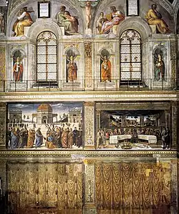 Chacun de ces artistes, avec l'aide de ses collaborateurs Pinturicchio, Piero di Cosimo et Bartolomeo della Gatta, peint l'un des quatre panneaux sur le mur à droite de l'autel, puis, avec un nouveau contrat daté du , ils sont reconfirmés pour l'exécution des dix autres panneaux restants (les deux sur le mur de l'autel avaient déjà été achevés par le Pérugin dans la toute première phase) à terminer en mars de l'année suivante. Les termes ne sont pas toujours respectés ; Luca Signorelli succède au Pérugin, qui a peint à la fresque le Testament et la mort de Moïse et la Contention autour du corps de Moïse sur le mur de l'entrée[12]. Le programme iconographique complexe est défini dans les moindres détails par le pape lui-même et ses conseillers, même si cette complexité même nécessite une intervention importante des artistes dans l'invention figurative et iconographique[15]. À noter la petite contribution picturale du maître Filippo Brunelleschi dans l'aile nord du bâtiment. Selon certains historiens, la conception du programme iconographique global a été reprise de l'Expositio super septem visiones libri apocalypsis, une exégèse d'épisodes bibliques remontant peut-être au IXe siècle[16], ou de l'œuvre de Joachim de Fiore, auteur d'une théorie complexe de la « concorde » entre l'Ancien et le Nouveau Testament.